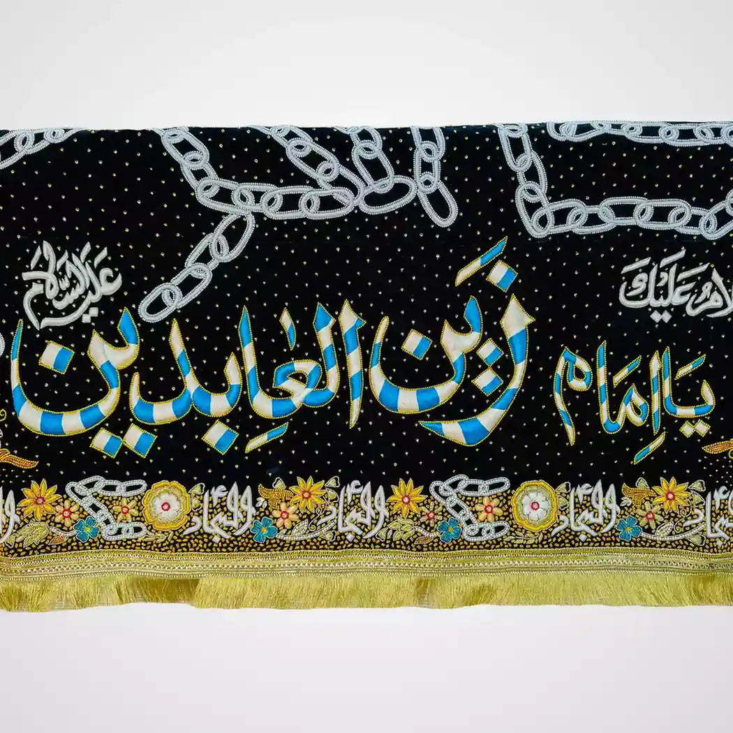 Honor the sacred memory of Imam Zain ul Abideen as with this exquisite Black Velvet Taboot Chaddar, adorned with intricate sequence work. Designed for Imambargah and Azakhana, this beautifully crafted chaddar features detailed embroidery and shimmering sequences that reflect reverence and devotion. Made from premium velvet, it provides a regal and respectful covering for the taboot, enhancing the spiritual atmosphere during religious observances. Embrace the tradition and elevate your commemoration with this elegant piece.