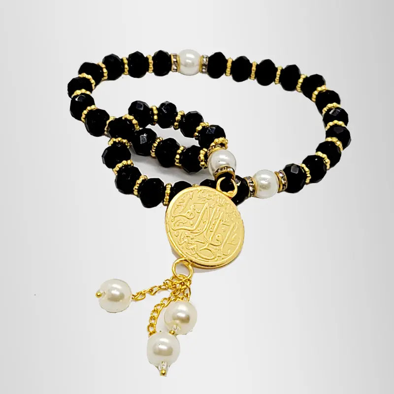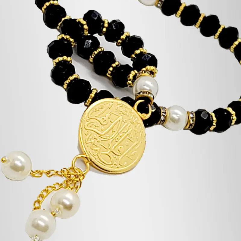 Black Crystal Tasbih Ya Fatima Zehra (sa), The Black Crystal Tasbih is beautiful made with round pendant with Pearls drop.