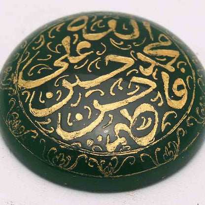 Take your collection to the next level with the engraving golden in color of Punjatan Names on this Green Aqeeq Stone Round Shape. Keep it close to you and feel its positive energy, blessings of the spirit, and for all times glory. Find out today how that specific stone will change your life. Own yours now and reap the rewards of its beauty and assistance.