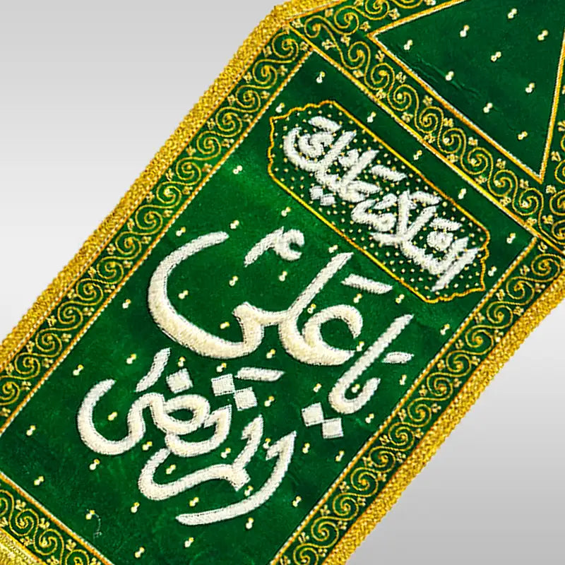 Mola Ali (as) Green Alam Cloth Pearls Moti Work, Its a Hand Work of Pearls / Moti Work Patka newly designed for the Azakhana. The border are designed to be simple with the name outstanding in front As'Salaam O Alyka Ya Ali Al Murtaza (as) to make it unique in size 40 inch (3.5 Ft) Approximately.