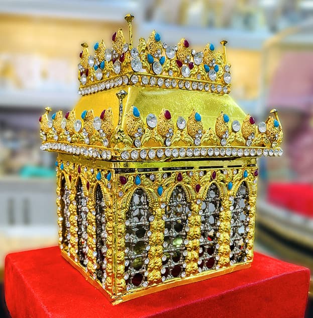Punjatan Tabarrukat Centre brings you newly designed Inner Zarih Mubarak of "Bibi Sakina (s.a)" made in Kashi work with gold polish. Zarih is a replica shrine of Jali Bibi Sakina (s.a), Zari can be placed in home azakhana or at imambargah. Inner Zarih has been made with a combination of small stones Feerozah & Ruby Stones to make it look more attractive.